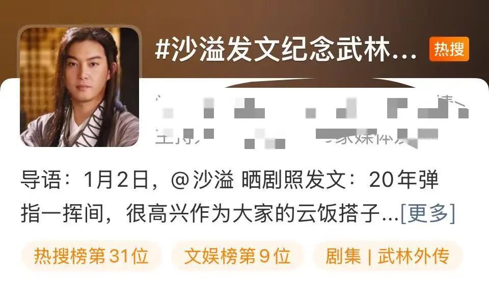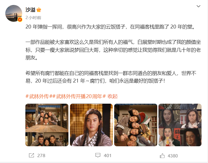 1月2日,沙溢晒剧照发文:20年弹指一挥间,很高兴作为大家的云饭搭子,在同福客栈里跑了20年的堂。